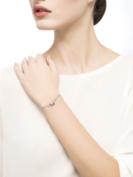 Taking inspiration from the world famous ring open-air theatre, the Colosseum, the B.Zo1 bracelet truly presents BVLGARI’s creative perspective and challenges the essence of jewelry design. Its unique and pure spiral shape symbolizes the harmonious coexistence of past, present and future – as embodied in the magnificent Eternal City – as well as the pioneering spirit of the collection. B. Zero1 series soft bracelet, made of 18K white gold and set with diamonds.